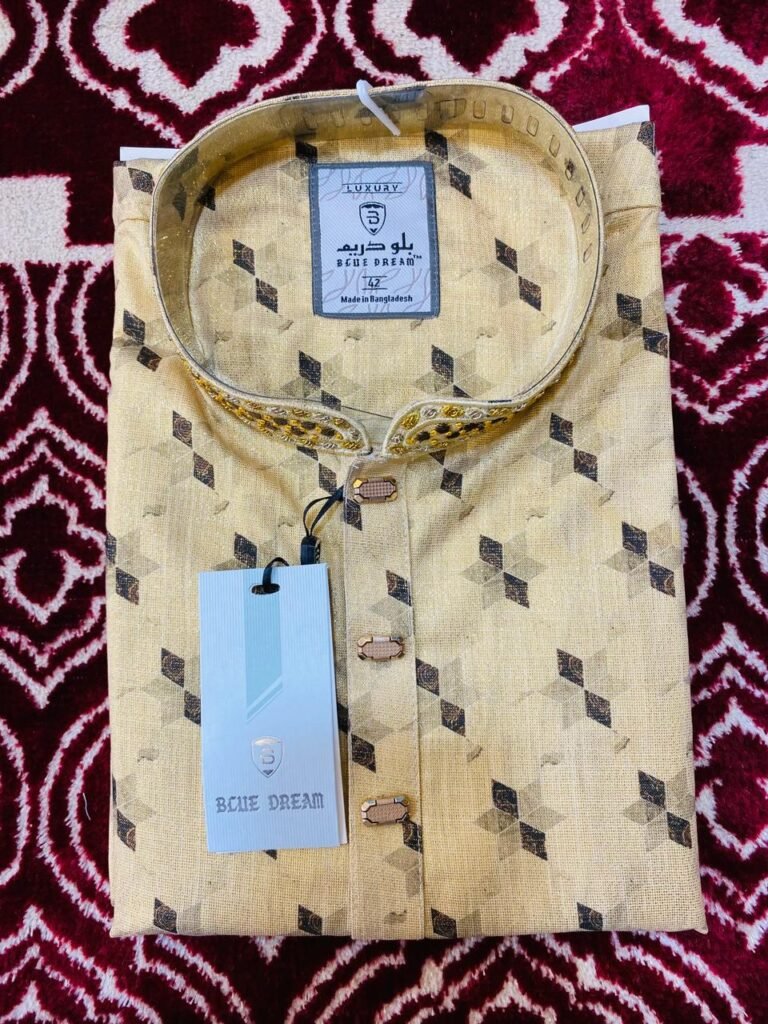 The Mandarin collar provides a contemporary touch, while the classic fit ensures that this panjabi drapes beautifully on the body, providing both a flattering silhouette and ease of movement. Perfectly suited for both formal and semi-formal occasions, this panjabi adds a touch of luxury to your wardrobe. The button-down closure completes the elegant design, offering a sleek and polished appearance.